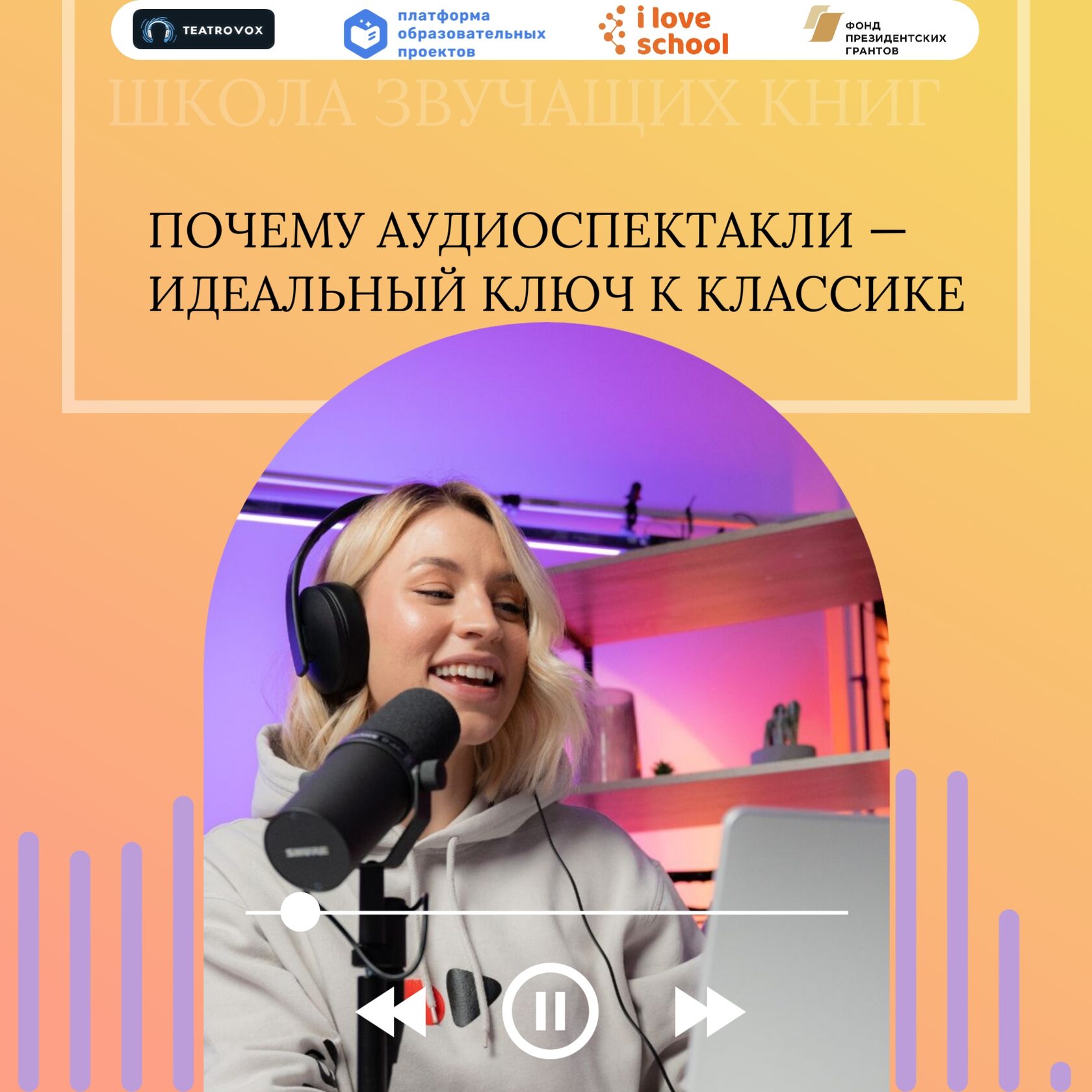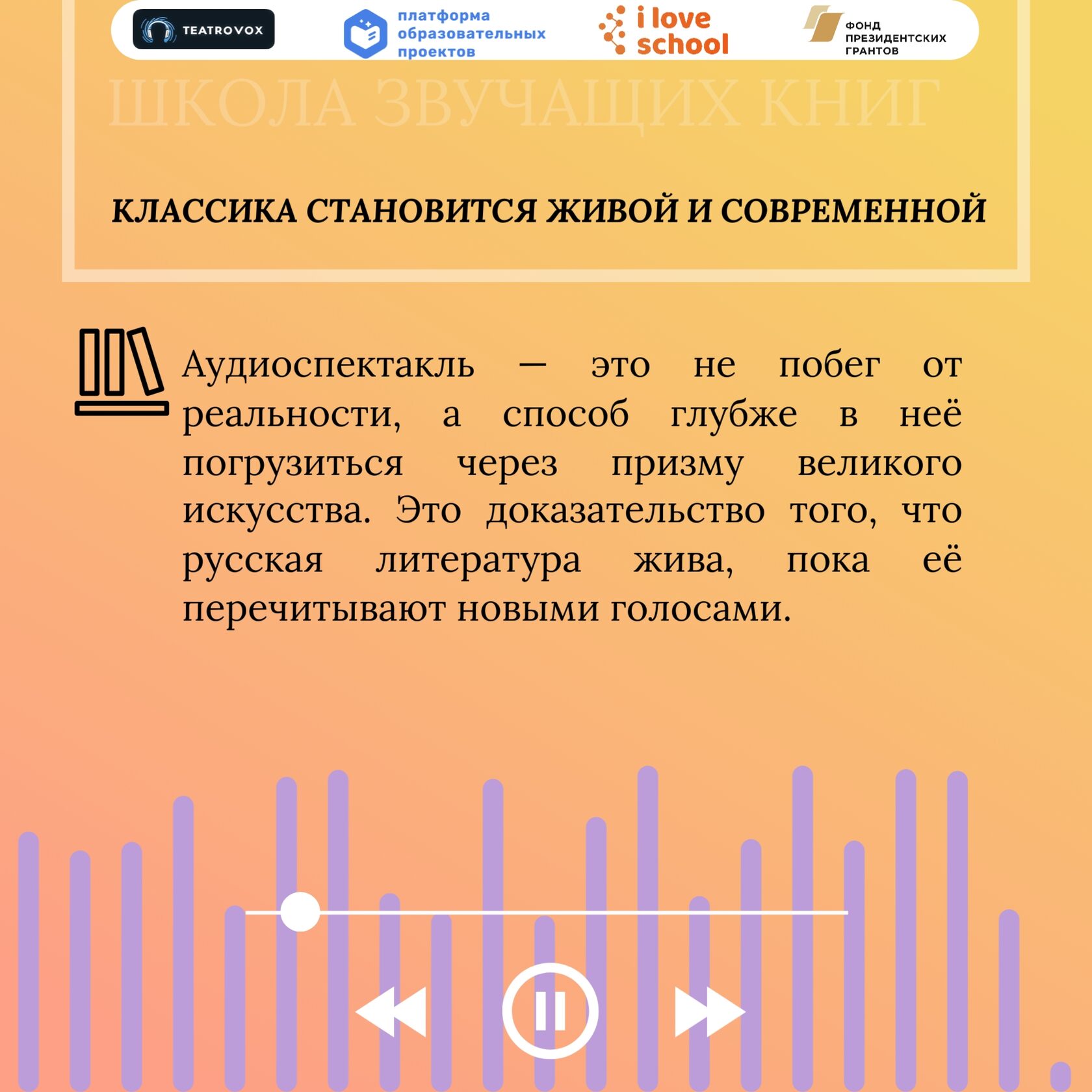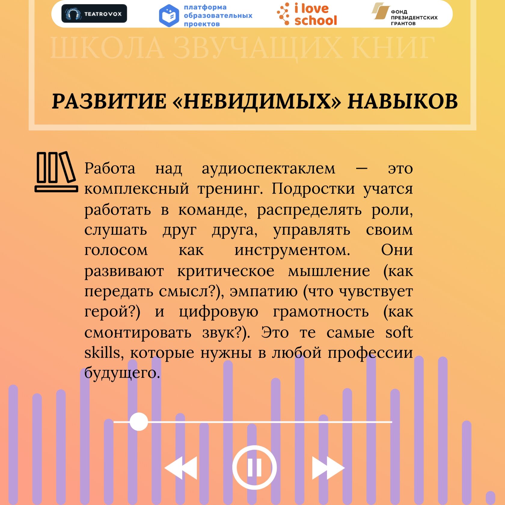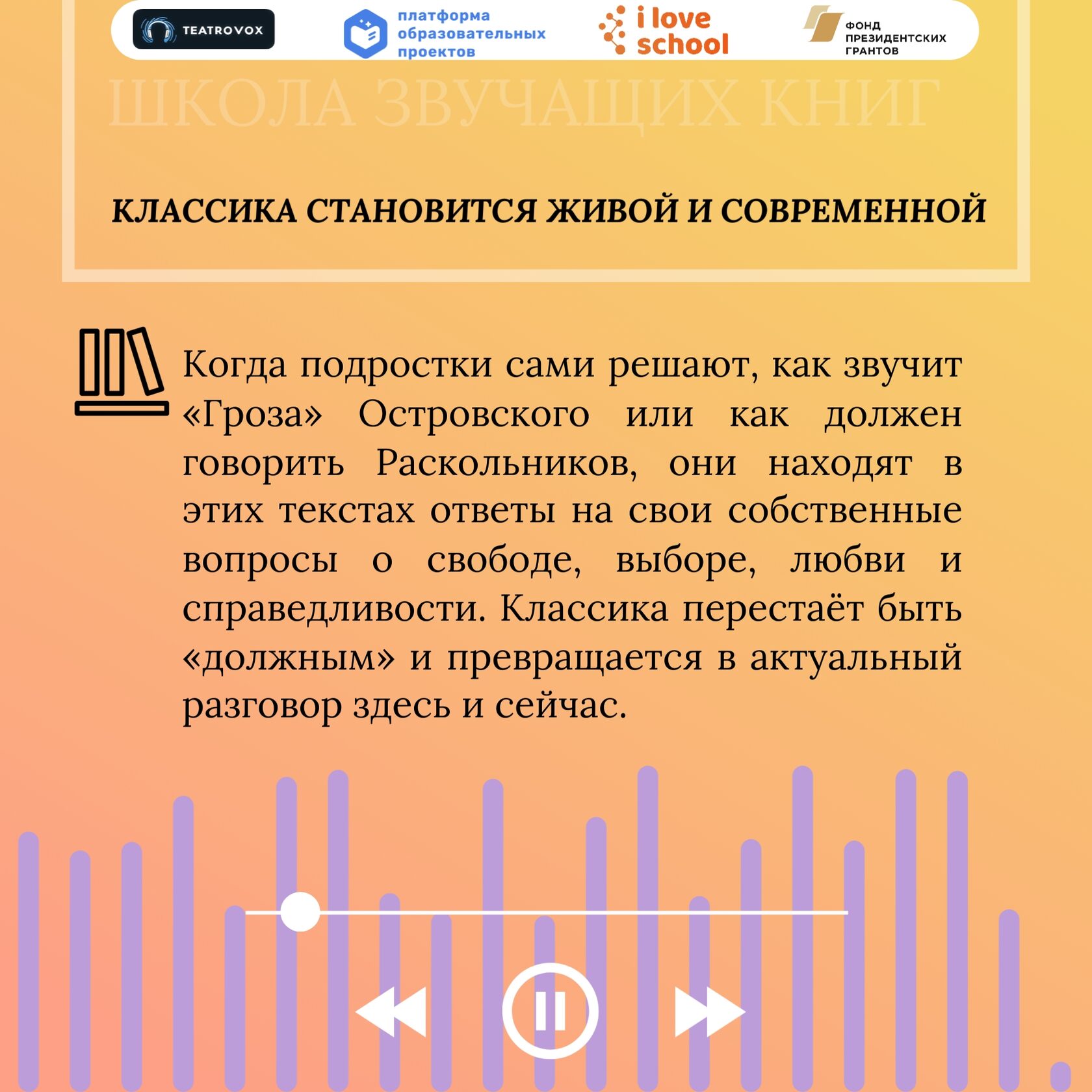 Проект "Школа звучащих книг: аудиоспектакли как инструмент повышения доступности образования для детей с ОВЗ" реализуется АНО "Платформа образовательных проектов" при поддержке гранта Президента Российской Федерации, предоставленного Фондом президентских грантов.
